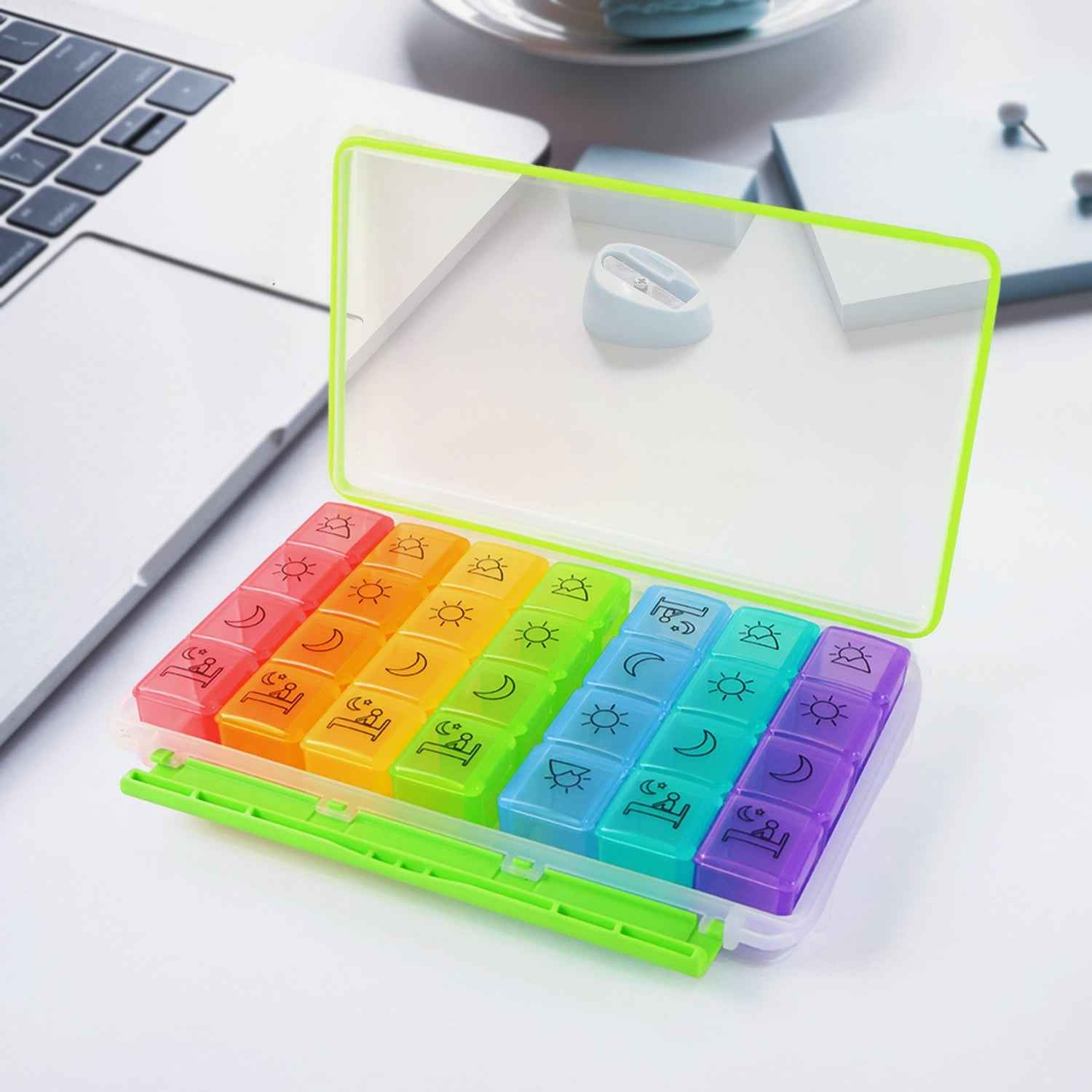 pill organizer , medicine storage box , daily dose container , pill divider case , tablet sorting box , weekly pill planner , travel pill holder , health routine tool , rainbow pill box , multicolor pill holder